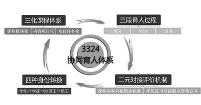 ——推进“四维融合”,分类设计实施现代学徒制特色课程体系,重构“3324”人才培养体系。针对现代学徒制校企供需不匹配的问题,黎明职业大学从关键要素与人才培养方案的设计、实施、就业、可持续发展等四个维度融合出发,重构了以“三化课程体系(课程模块化、内容项目化、项目任务化)”“三段育人过程(知岗—轮岗—顶岗)”“二元对接评价机制(课程内容对接职业标准、学历证书对接职业资格证书)”“四种身份转换(学生—学徒—准员工—员工)”为内涵的“3324”人才培养体系。